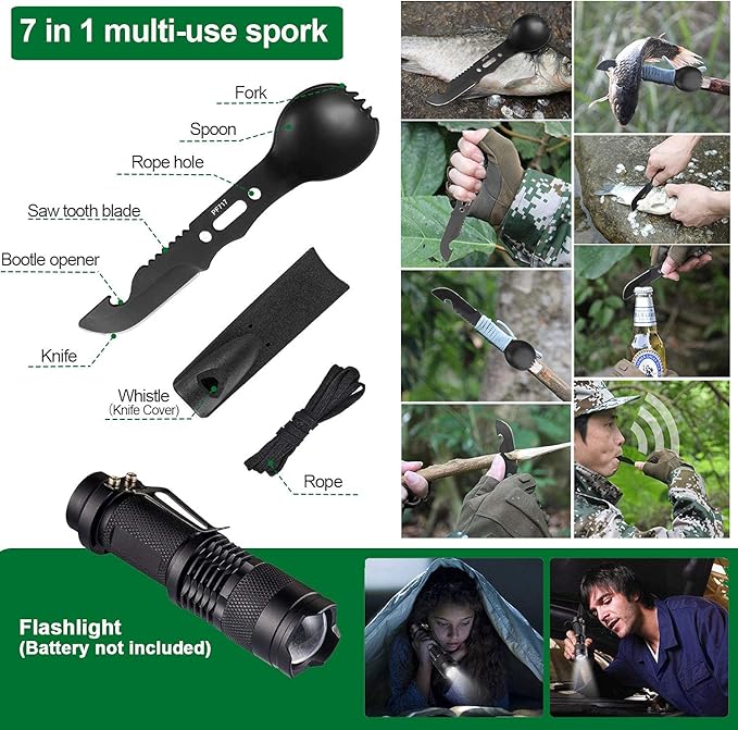 - 【Life Saving Tools】- Nice variety of cool tools and gadgets has the essentials you need to feel secure when adventuring outdoors. Getting lost, needing a fire, cold or rainy conditions are no longer a problem when you have our life saving tools. Be prepared, be safe, This survival gear military tactical kit is all you need when the unexpected happens