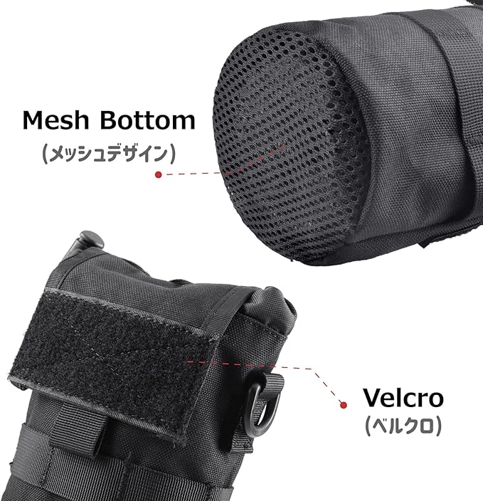 - ☘️ MOLLE WATER BOTTLE HOLDER: Drawstring Open Top & Mesh Bottom. Highly flexible, so you can also use it to hold your umbrella. Packaging Dimensions: 3.94 x 4.33 inch (10 x 11 cm); 3D Size: 3.94 x 9.06 inch (10 x 23 cm)