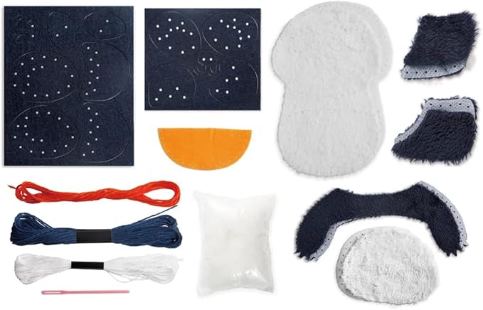- Contents: pre-cut felt pieces and fabrics, filling, various threads, plastic sewing needle and instructions with illustrations.