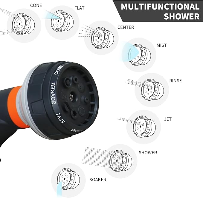 - ▶ Water gun design: The nozzle can be rotated 360 degrees, there are 8 watering modes, and these watering modes can be selected,It can be used for showering, washing fruits, watering flowers, etc. Sprayers for indoor and outdoor use are limited to your imagination.