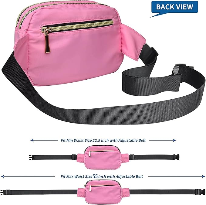 - ADJUSTABLE WAIST BELT - FIT WAIST SIZE RANGE 22.5" to 55": The black fanny pack for women and men is plus size friendly with adjustable belt can fit waist size range 22.5" to 55".One size fit all- suitable for adults,teen, girls,boy even kids as crossbody pack.The belt can be adjusted to whatever length according to your body.This fanny pack for women fashionable allows for different wearing styles: as crossbody fanny bags, sling bag, Disney fanny pack.