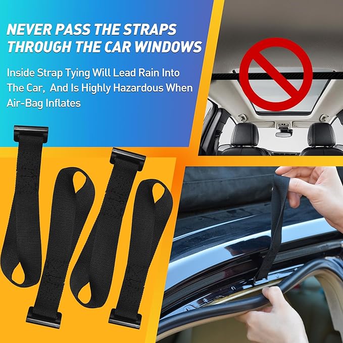 - EASY INSTALLATION & UNIVERSAL COMPATIBILITY: Load it up, attach it and hit the road in minutes. For cars have racks, attach the carrier's straps to a vehicle’s roof rack. For cars have no rack, use the Car Clips to attach the straps to a vehicle's door frame weather molding. Our unique strap system will secure your rooftop cargo bag at any highway speed or in the bumpiest road.