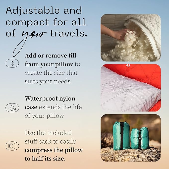 - Adjust It and Enjoy Restful Sleep: Our backpacking pillow is compressible and adaptable to any environment. Add or remove foam to select the right fill for you. You'll enjoy restful sleep, no matter if you're in a hotel or hiking.