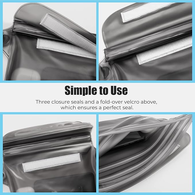 - šššļ¼ ššššš«š©š«šØšØš - The waterproof pouch bag made from high quality and tough PVC material with waterproof coating. Super waterproof seal performance IP68 waterproof and scratch-resistant material have been upgraded and more durable! The dry bag with three Zip-lock Seals and a Folding Velcro over top. Perfect for camping, hiking, snorkeling, swimming, sailing, paddle surfing, tubing, kayaking, rafting, water slides or water sports, etc.