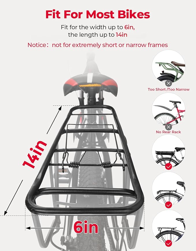 - Compatibility: Fits most bike racks, including those for city, mountain, road, electric, and hybrid bikes, etc. Please confirm your bike rack size before purchasing. Compatible: Support for Width Less Than 6 inches Bike Rack