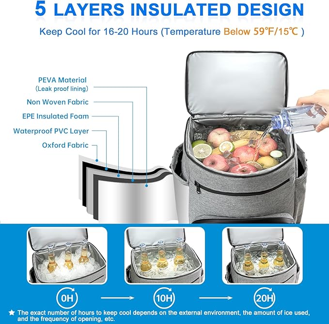 - 【5 Layer Leakproof & Insulated Design】The insulation layer of the bookbag cooler is made of leak-proof PEVA lining, EPE insulating foam and waterproof PVC to ensure leak-proof and keep food or drinks cool for up to 16-20 hours or warm for up to 6 hours. Insulated backpack outer layer is made of high quality wear-resistant material, easy to clean and more durable at the same time.