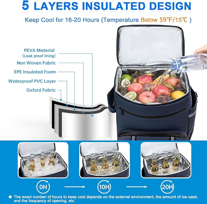 - 【5 Layer Leakproof & Insulated Design】The insulation layer of the bookbag cooler is made of leak-proof PEVA lining, EPE insulating foam and waterproof PVC to ensure leak-proof and keep food or drinks cool for up to 16-20 hours or warm for up to 6 hours. Insulated backpack outer layer is made of high quality wear-resistant material, easy to clean and more durable at the same time.