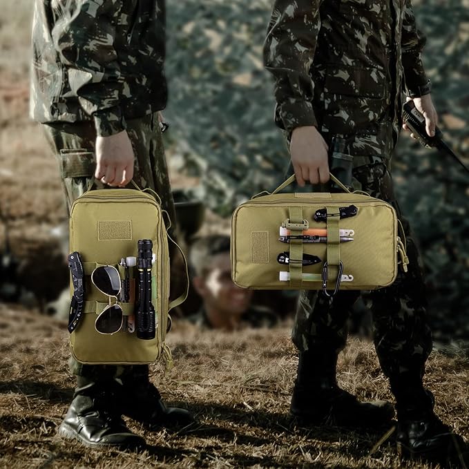 - When the storage bag is closed, you can carry it with the handles from three sides. You can also use it as cross chest bag with tour shoulder strap. Multiple methods to carry. There are two areas to add the patchs you like and there are many molle panels to add small items like tactical flashlight, tactical knife.