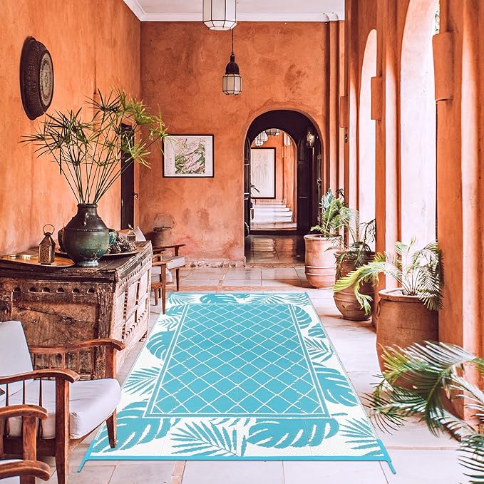 - Reversible Geometric Patio Rug: The uniquely designed pattern is classic and stylish. This elegant outdoor area rug features a reversible design that blends perfectly with your space on either side, you can flip the waterproof deck rug to quickly refresh the look of your space. The RV camping rug is available in a variety of colors to meet your different needs, adding a splash of color to your outdoor space.