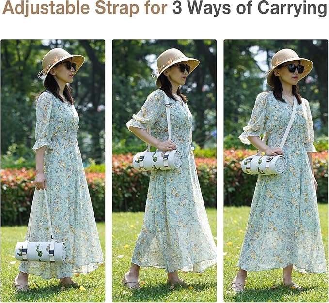 - 【Extended Carrying Strap】There are three ways to use the carrying strap of the sand free beach blanket. The portable picnic blanket can be carried easily by hand, on either shoulder by adjusting to the proper lengths, so you can carry other picnic suppliers with the other hand, or even two hands.The buckle is a smart equipment to fasten and unfasten the closing straps, even when the roll of the picnic blanket is thicker than original.