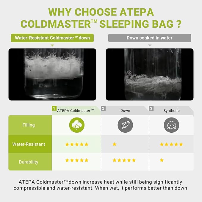 - 0 DEGREE DOWN SLEEPING BAG: Our cold weather sleeping bag are filled with 600g of coldmaster down (70% white duck down and 30% renewable Down Alternative) for superior heat retention. The 20D 400T nylon shell is water-resistant, while chest collar and hood drawstring create a micro-warmth zone. Windproof strips, velcro, semi-circular detachable drawstring hood and 3D baffle box construction are designed to prevent cold spots and lock in heat