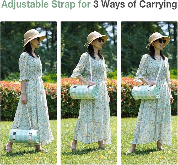 - HIGH QUALITY FABRIC: The top fabric is made of durable polyester, and printed with classic neutral green white check, the color printed is safe and fastened, not easy to fade as time goes. The soft cotton padded in the middle, making the picnic blanket soft and comfortable to sit and lie down.