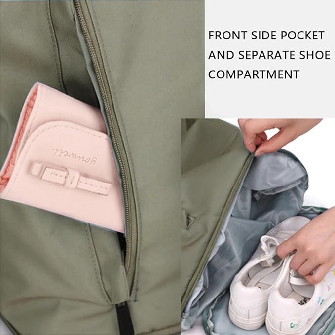 - 5 Pockets: 1 front zippered pocket, 1 large capacity internal main pocket, 1 wet/dry pocket, 1 small zippered compartment pocket, 1 separate shoe compartment.