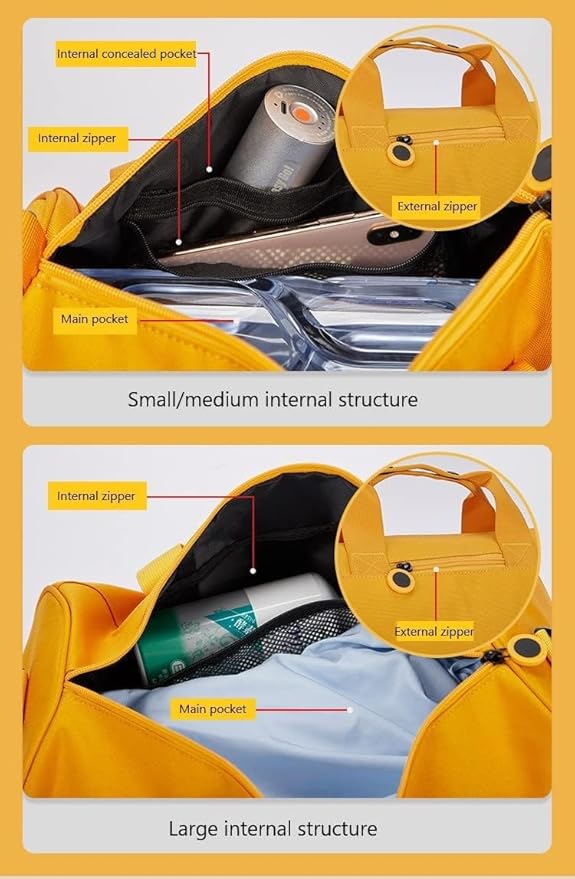 - 【Dry Wet Separate Duffel Bag】This duffle bag for women delivers roomy main compartment to store your clothes and items. A zippered waterproof lined pocket for wet clothes or towels and swimsuits.