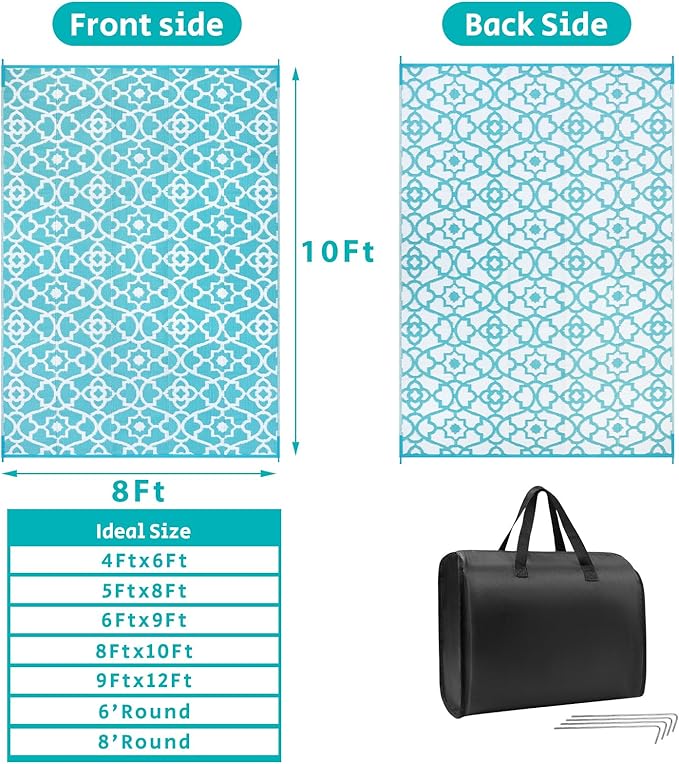- Versatile Outdoor Carpet: The indoor outdoor plastic rugs have multiple choice in different colors(4'x6',5'x8',6'x9',8'x10',9'x12',9'x18',8'round), is ideal for a variety of indoor outdoor activities,like patio mat, deck rug, garden rug, beach mat, picnic mat, BBQ party mat, rv camping rug,pool rug,outdoor doormat,garage rug,front door mat,allowing you to have plenty of imaginable space for more fun.