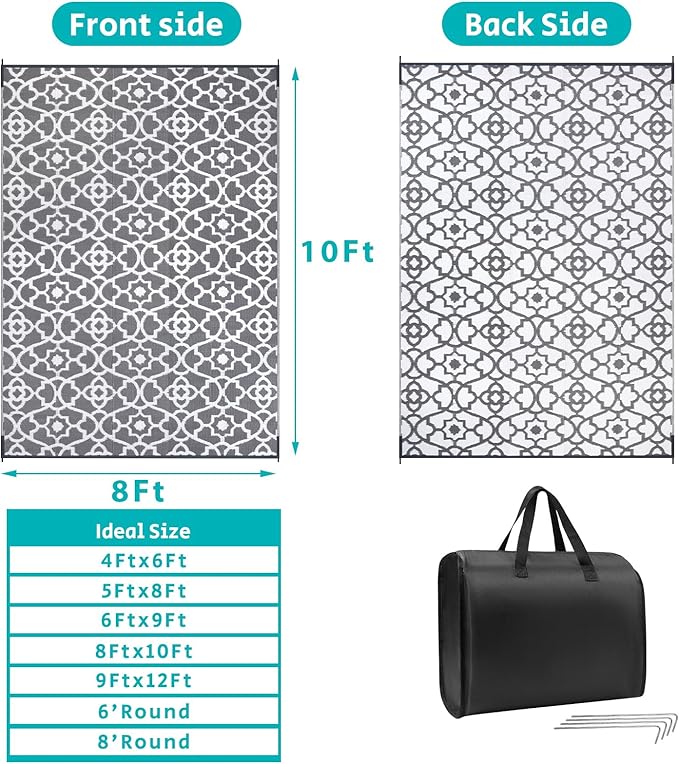 - XXL Large Reversible Outdoor Rugs: Featuring a classic moroccan pattern on both sides, this rectangular 8x10 ft outdoor area rug allows you to instantly refresh your patio, porch, backyard, deck, RV campsite. And this outdoor deck rug is reversible, two-sided design allows you to have two different looks,both sides can blend perfectly with nature and look very full and comfortable.