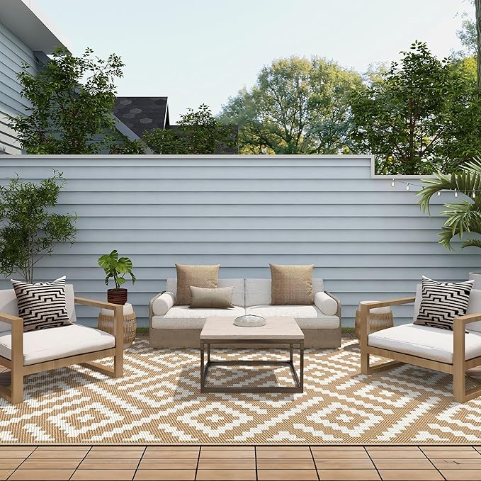 GENIMO Outdoor Rug for Patio Clearance, 6'x9' Waterproof Camping Mat, Reversible Plastic Straw Rugs for RV, Camper, Balcony, Backyard, Picnic, Deck (Brown & White)