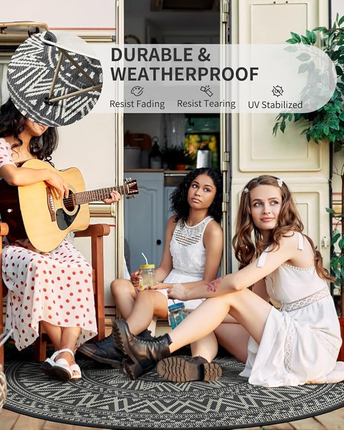 MontVoo Outdoor Rug Carpet Waterproof Round 8ft Outdoor Patio Rug Mat Reverisble Plastic Straw Outdoor Rug for RV Camping Picnic Beach Balcony Boho Grey