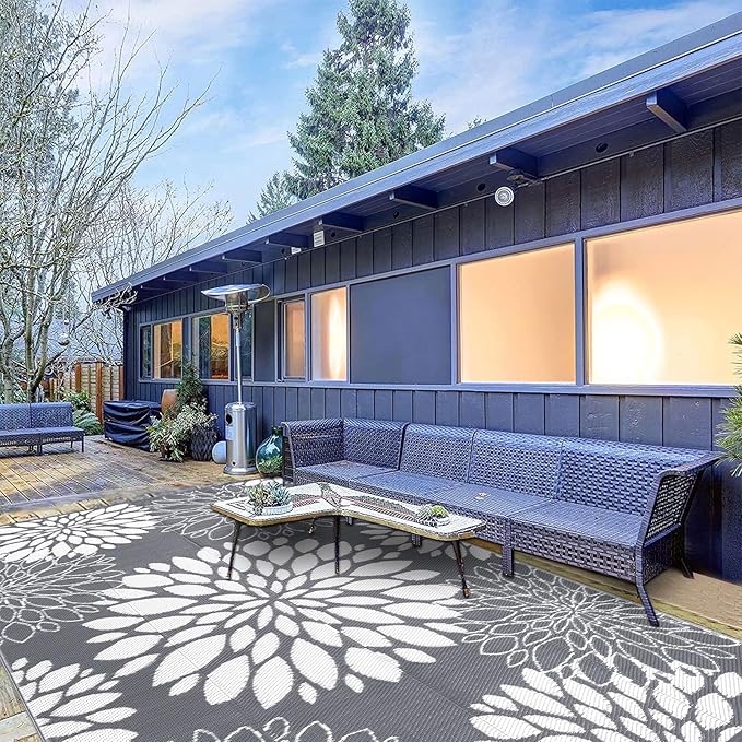 Ileading Reversible Outdoor Rug 6x9Ft Waterproof Patio Rug Carpet Portable Outdoor Plastic Straw Rug Large RV Camping Mat Rug for Patio, Clearance, Deck, Beach, Porch, Camping, Picnic, Flower Grey