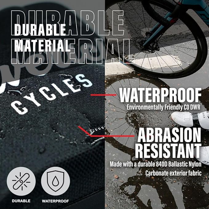 - WATERPROOF AND PROTECTIVE: Crafted from high-quality nylon fabric on the outside and lined with TPU material on the inside, this bag offers comprehensive protection for your cycling gear. Its waterproof zipper with a special adhesive keeps your belongings dry in all conditions.