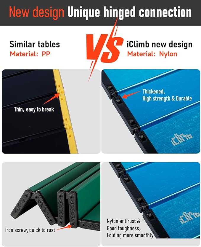 - Ultralight, made of aerospace-grade aluminum alloy, only 2.5 lbs; Max Load 88 lbs; Unlike wooden or nylon-top tables, this table is durable, waterproof, corrosion-resistant, easy to clean; Sturdy joints and connectors, plus anti-slip rubber feet make this table more stable, and the legs won't fold, bend, or disengage on different terrain; Very easy to set up, just open the base frame and attach the table top, enjoy your leisure time in seconds