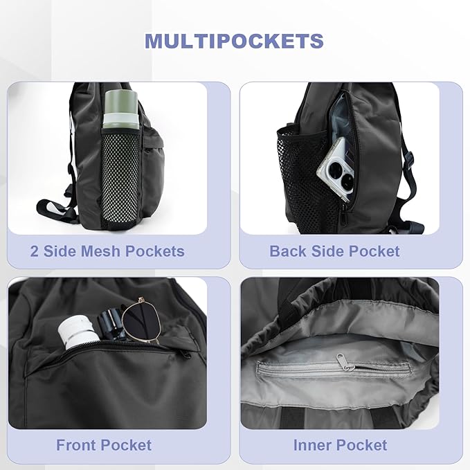 - Convenient Multi Pockets: The drawstring gym bag has a back side pocket, designed to keep your cell phone and wallet secure. The front zipper pocket offers easy access to keys or ID cards, eliminating the need for digging. Besides, two side mesh pockets allow you to place a water bottle, umbrella easily. Inside of sport bag, the zipper pocket can hold small valuables. Multiple Pockets help you to keep things to be placed by category, easy to be found.