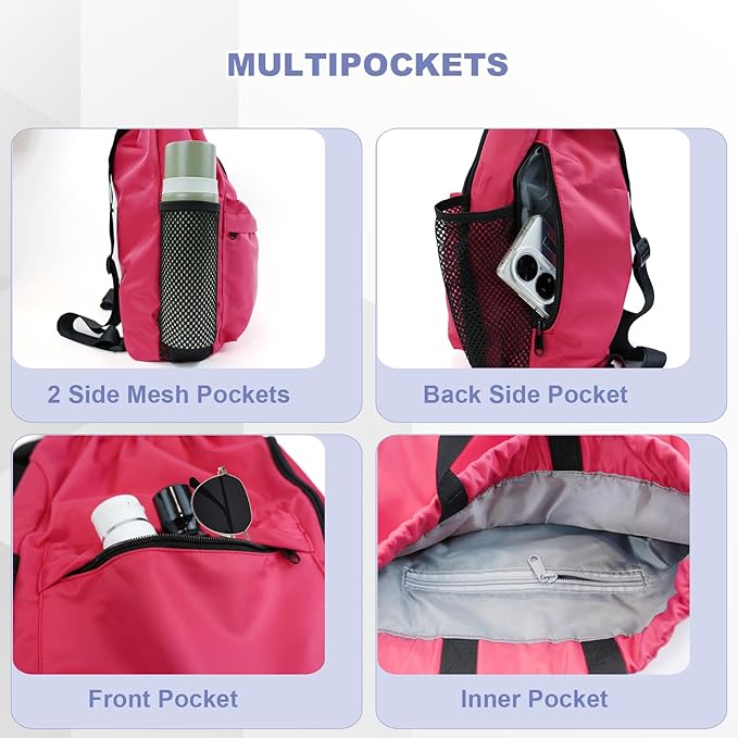 - Convenient Multi Pockets: The drawstring gym bag has a back side pocket, designed to keep your cell phone and wallet secure. The front zipper pocket offers easy access to keys or ID cards, eliminating the need for digging. Besides, two side mesh pockets allow you to place a water bottle, umbrella easily. Inside of sport bag, the zipper pocket can hold small valuables. Multiple Pockets help you to keep things to be placed by category, easy to be found.
