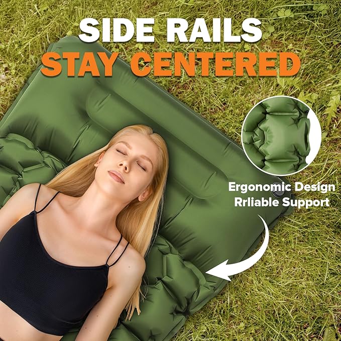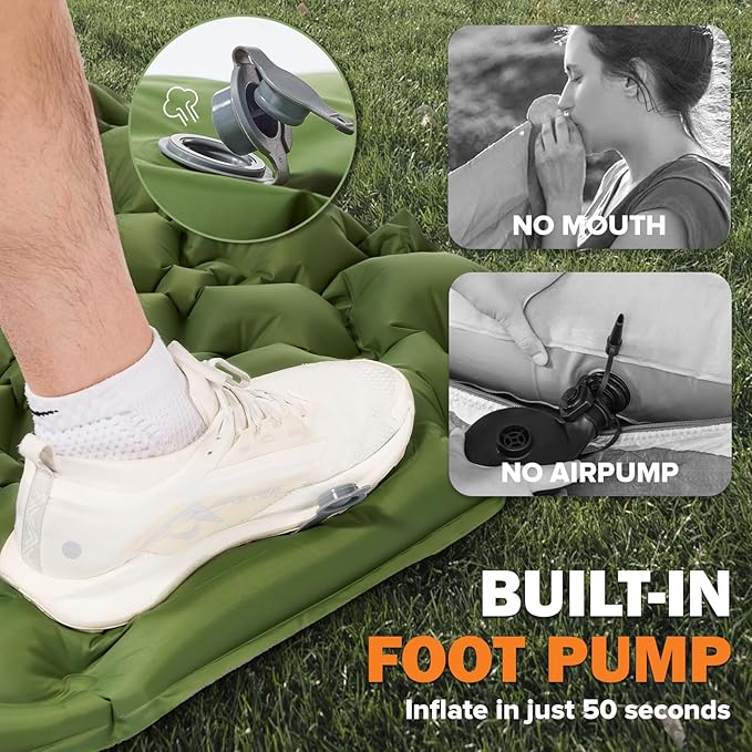 - Easy Foot Pump Inflation: Built in pump delivers fast one-way inflation and rapid deflation. Our sleeping pad for camping easy to be inflated by foot pump with no blowing required, saving your breath after a long exhausting day. Deflation is also quick and easy so you can catch up with your hiking journey. Besides, two double layer valves on the pillow can effectively prevent air leakage and achieve rapid deflation. And with inbuilt pillow, no need to carry extra camping pillow.