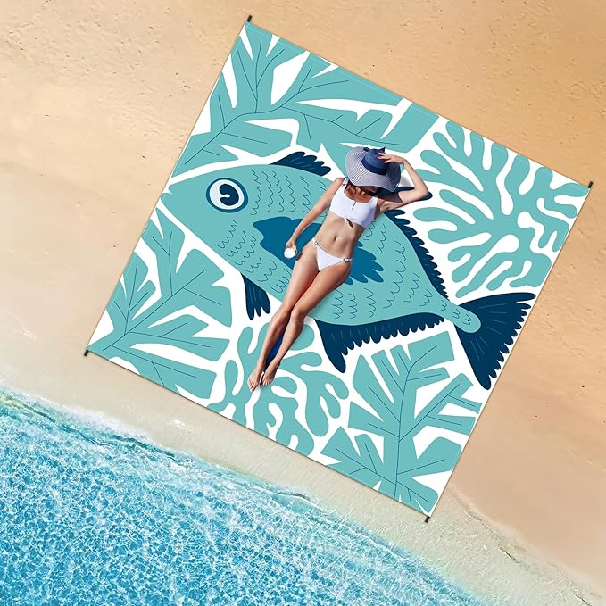 Large Beach Blanket Waterproof Sandproof 79"x 83" for 1-4 Adults,Quick Drying Beach Mat,Lightweight & Durable,Beach Essentials for Family Beach Camping Travel Picnic(Green Fish)