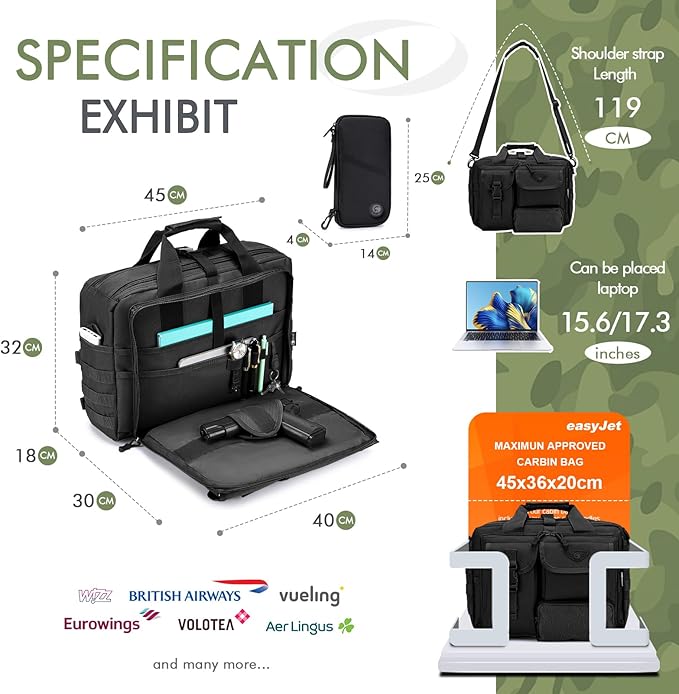 - 【Spacious Capacity】— Tactical Laptop Bag's sized is 18.5x12.6x5.9 inch / 47x32x18cm . It's a large laptop briefcase to hold all kinds of stuff, such as laptop, tablet, mobile phone, A4 document, business paper, pen, portable fan, Industrial measuring tape and on. Easy enough to fit in luggage checking box for most airline companies and avoid excess luggage charges.