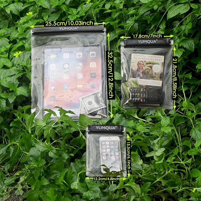 - 【Different Size】 Three sizes of these waterproof bags are 4.8"*6.1", 7"*8.58" and 10.03"*12.8", offering ample space to hold items of various sizes. These bags prevent Water, Humidity, Sand and Snow from harming your valuables.