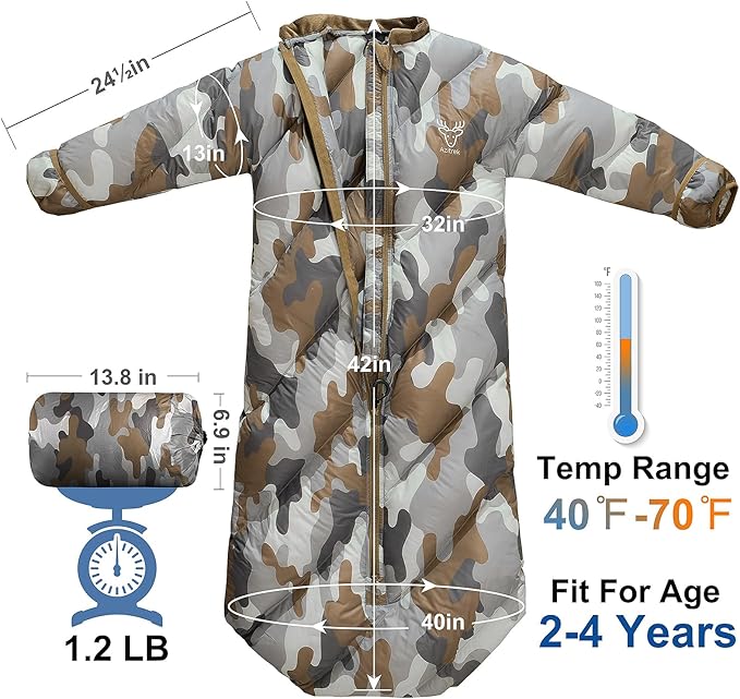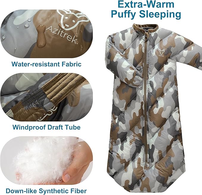 - CUSTOMIZABLE WARMTH & MOBILITY: Designed with unique sleeves featuring adjustable open & close cuffs, plus the draft tube protected 2-way zipper, this sleeping bag offers a personalized warmth experience while remaining hands free and certain mobility, making it perfect for outdoor adventures, or indoor forts and slumber parties.