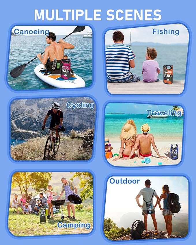 - Great Matching for Versatile Use: The 2L roll top backpack sack is very useful for water activities, including swimming, kayaking, beach trips, rafting, boating, hiking, camping, and fishing. Perfect for both wet and dry storage needs.