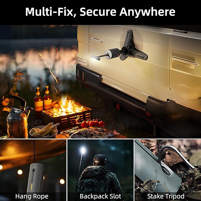 - 5-in-1 Outdoor Multi-Tool. Functions as a tent light, work lamp, emergency beacon, phone charger, and magnetic flashlight camping essential gear accessories. PC shade enhances visibility