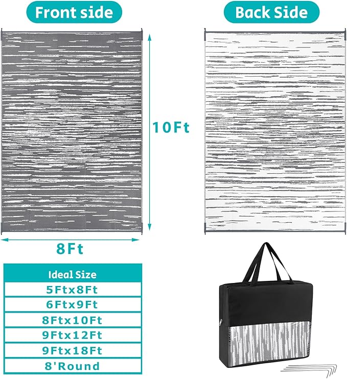 - XXL Large Reversible Outdoor Rugs: Featuring a classic striped pattern on both sides, this rectangular 8x10 ft outdoor area rug allows you to instantly refresh your patio, porch, backyard, deck, RV campsite. And this outdoor deck rug is reversible, two-sided design allows you to have two different looks,both sides can blend perfectly with nature and look very full and comfortable.