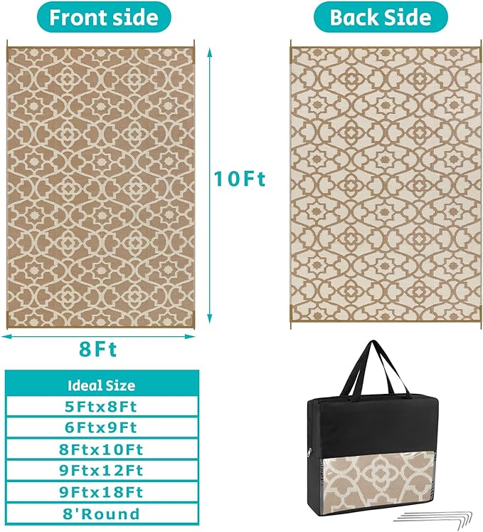 • XXL Large Reversible Outdoor Rugs: Featuring a classic moroccan pattern on both sides, this rectangular 8x10 ft outdoor area rug allows you to instantly refresh your patio, porch, backyard, deck, RV campsite. And this outdoor deck rug is reversible, two-sided design allows you to have two different looks,both sides can blend perfectly with nature and look very full and comfortable.