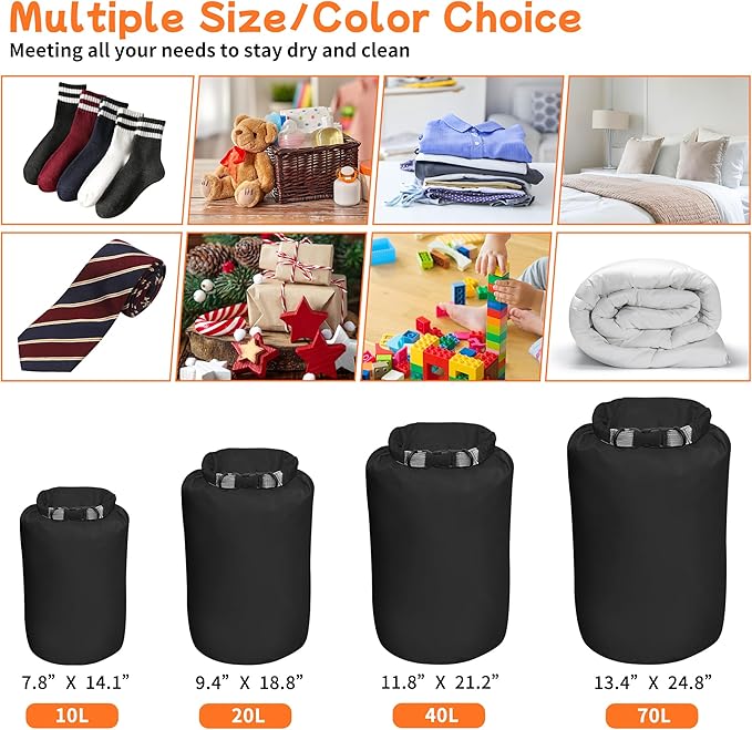 • 【Multiple Color/Size Choice】You can choose from orange, green, blue and purple. Any of the bright colors bringing you a bright mood and making your outing or storage room a beautiful scenery. We have waterproof dry sacks from small to large, ranging from 10L, 20L, 40L to 70L, meeting all your needs to stay dry and clean.
