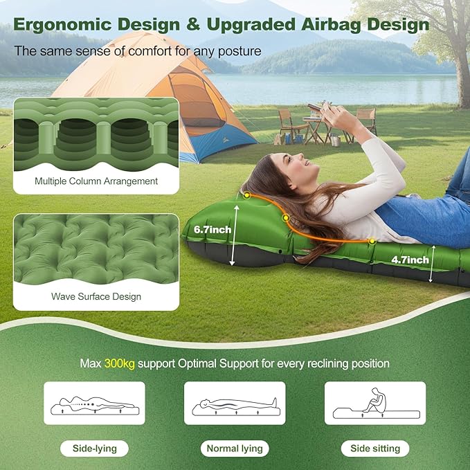 - π First Class Support With 4.7-inch Thickness - The U-shaped structure on the surface and the internal support construction ensure that your spine is optimally supported, even with a maximum load of 660lb. The 4.7" thick sleeping pad protects you from cold ground and hard stones. The ergonomic pillow area of 6.7" guarantees additional comfort for a restful night's sleep.