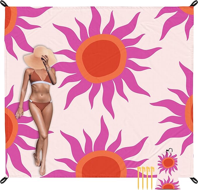 Large Beach Blanket Waterproof Sandproof, 86"×78" Beach Mat Sand Free for 2-4 Adults with Stakes and Sand Pocket, Foldable Picnic Blankets for Outdoor, Camping Hiking, Vacation Essentials-Boho Sunset