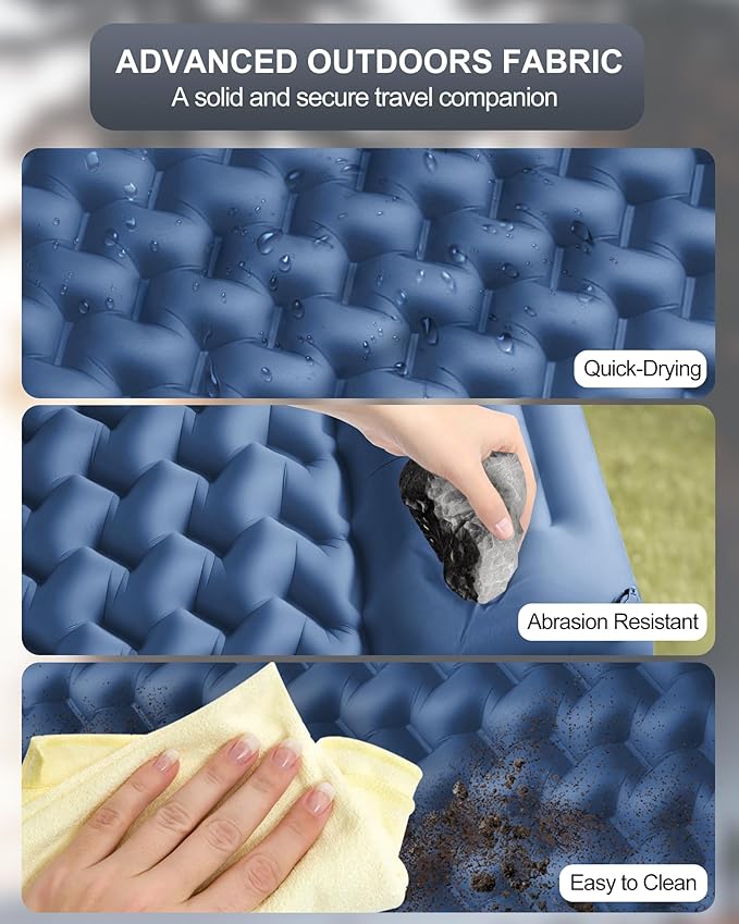 - [Rugged, Quick-Dry Material for Outdoor Use] - Made of upgraded 50D nylon and TPU, this camp sleep pad is tear-resistant, water-repellent, and built to handle rough ground like sand, rocks, or wet grass. Even after a rainy night, it dries fast and stays tough