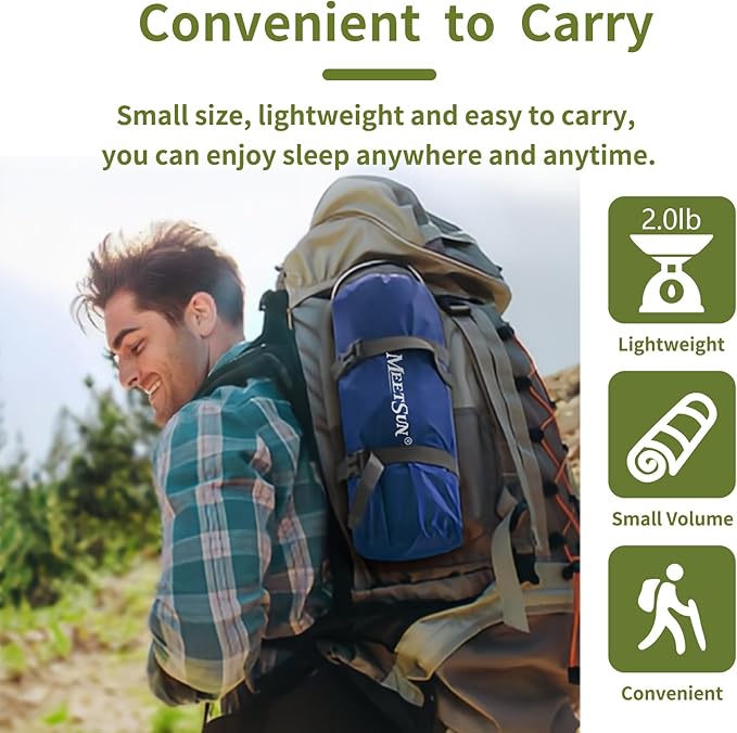 - 2.【Ultralight,Thickened,Portable and Easy to Store】 The ultralight sleeping pad for camping weighs only 2 pounds, and it's just the size of a water bottle when deflated and folded.Compared to most other inflatable sleeping pad, our sleeping pads are inflated to a thickness of 5.2 inches.This camping pads for sleeping with inbuilt pillow also saves you the trouble of carrying an extra pillow. The camping mattress pad can easily fit in your backpack and take it with you. Perfect for hiking, camping, backpacking, traveling, climbing, hiking and other outdoor activities.