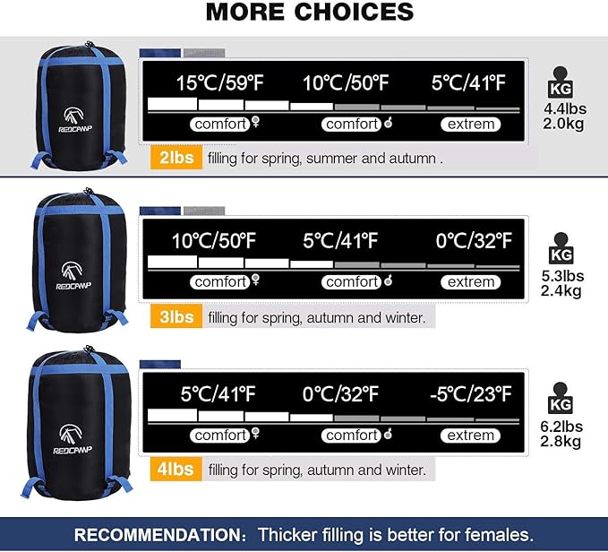 - Temperature Range: 2lbs filling flannel sleeping bags for adults are comfort in 50°F/10 °C and fits temperature range 41 - 59 °F/ 5- 15 °C. 3lbs filling sleeping bags is comfort in 41°F/5°C and fits temperature range 32-50 °F/0-10 °C. Females are recommended to choose the thicker sleeping bags.
