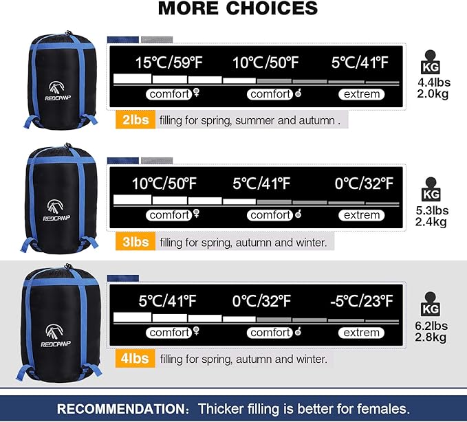 • EXTRA WARMTH: The 80% cotton lined adult sleeping bag is comfortable for different temperatures and is designed with a 2,3 or 4 lbs filling.