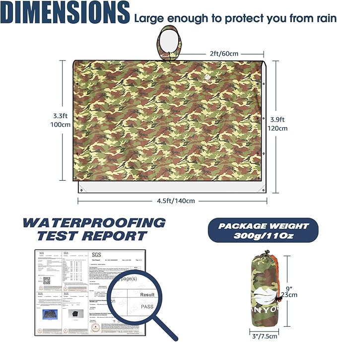 - Waterproof and Sturdy Material: The rain poncho is made of 210T ripstop polyester + TPU coating, this rain poncho is PU5000MM waterproof.To enhance the waterproofing capabilities of a rain poncho,we use techniques such as seam sealing or taping to ensure that water cannot seep through the seams.It comes with a drawstring hood, hook and loop fasteners along the sides ensures the optimal fit,which is good for protecting your head and face.