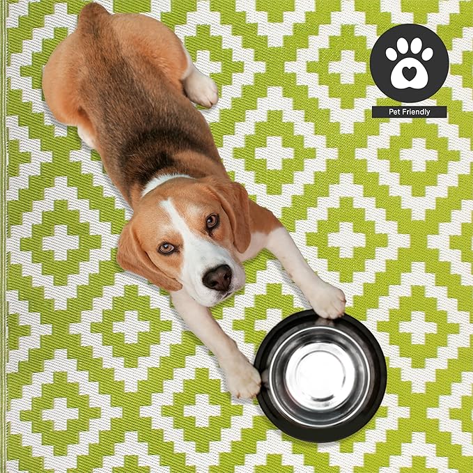 FH Home Outdoor Rug - Waterproof, Fade Resistant, Reversible - Premium Recycled Plastic - Geometric - Porch, Deck, Balcony, Mudroom, Laundry Room, Patio - Aztec - Green & White Crease Free - 3 x 5 ft