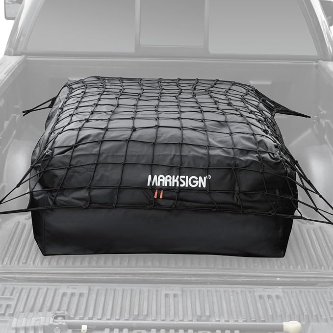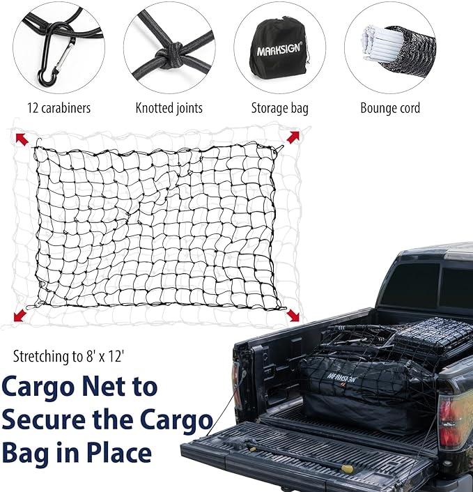 - HEAVY DUTY CARGO NET INCLUDED: Each bag comes with a heavy duty 4'x 6' bungee net stretches to 8'x12' to keep the cargo bag firmly in place, preventing it from blowing up when you are driving. 12 strong metal carbiners are also included for easy and secure tie-down.