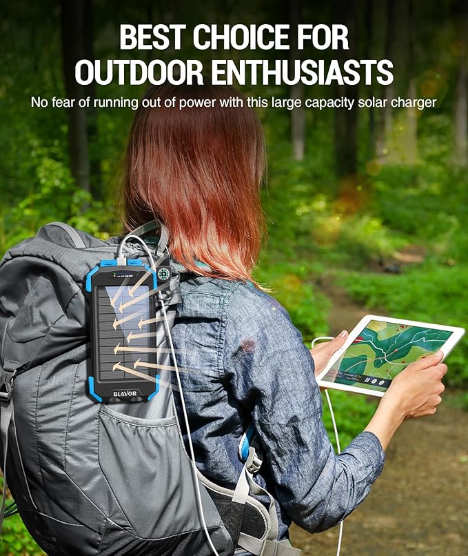 • Multi-Purpose Outdoor Power Bank: BLAVOR portable solar charger is made to be IPX5 waterproof, dustproof and shockproof. The built-in dual super bright flashlights and the included compass carabiner can further ensure your safety when traveling outdoors, making it an ideal companion for outdoor enthusiasts.
