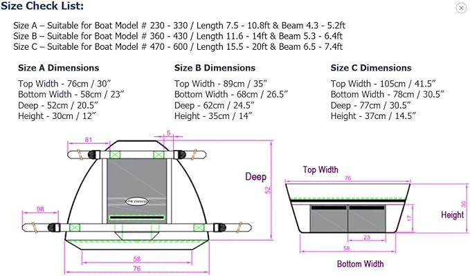 - Size Check List: Size A – Suitable for Inflatable Boat Model # 230 – 330 (Boat Overall Length 7.5 - 10.8ft & Beam 4.3 - 5.2ft) Size B – Suitable for Inflatable Boat Model # 360 – 430 (Boat Overall Length 11.6 - 14ft & Beam 5.3 - 6.4ft) Size C – Suitable for Inflatable Boat Model # 470 - 600 (Boat Overall Length 15.5 - 20ft & Beam 6.5 - 7.4ft)