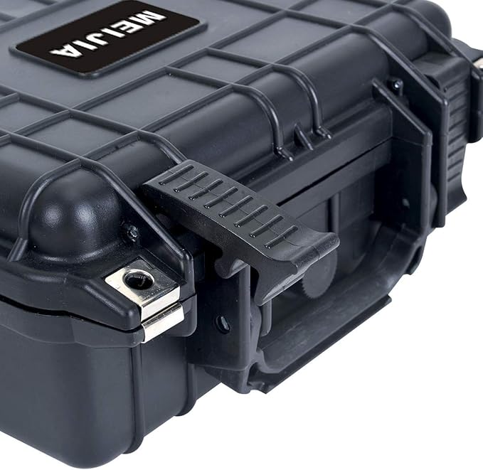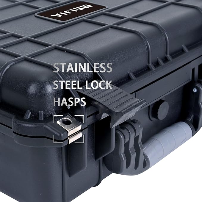- Outside Dimension: Length 10.62inches Width 9.68Inches Height 6.87 inches.Inside Dimension: Length 9.25inches Width 7.12Inch Height 4.12 inch.Lid Depth:1.19inch.Bottom Depth:2.93inch.Padlock Hole Diameter:0.19".Weight With Foam:2.75 lbs .Full sides of protection for your loved things. Made with Polyethylene (PET) in Injection Molded construction.Whether you're caught in rain or our at sea. MEIJIA case always protect your valuables.