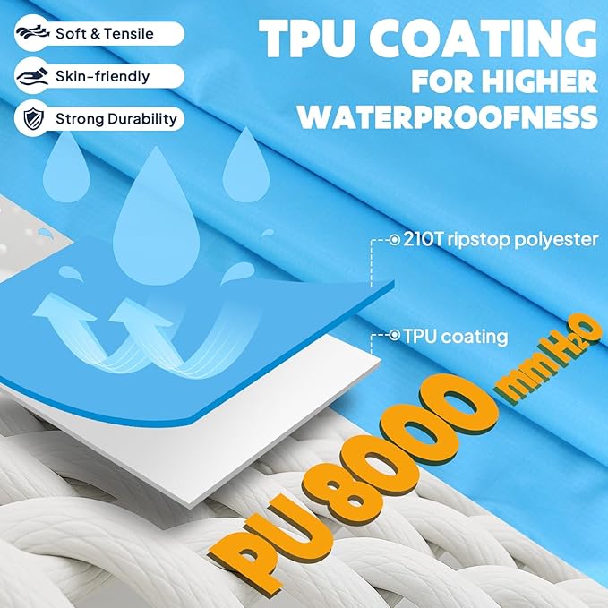 - Waterproof and Sturdy Material: The rain poncho is made of 210T ripstop polyester + TPU coating, this rain poncho is PU8000MM waterproof.To enhance the waterproofing capabilities of a rain poncho,we use techniques such as seam sealing or taping to ensure that water cannot seep through the seams.It comes with a drawstring hood, hook and loop fasteners along the sides ensures the optimal fit,which is good for protecting your head and face.